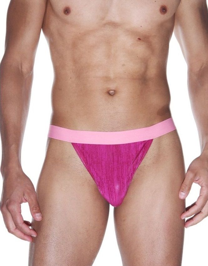 Гладкие блестящие ярко-розовые тонги на широком поясе.