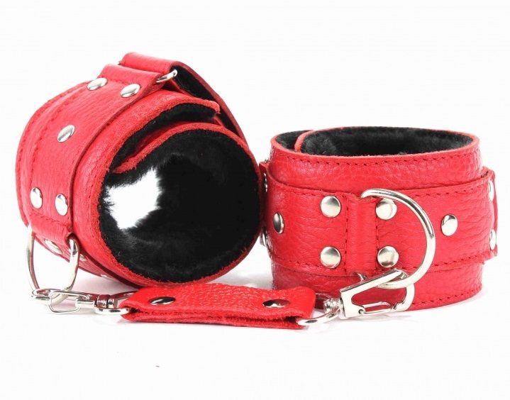 Кожаные наручники красного цвета. Украшены заклепками и соединяются между собой цепью с карабинами. Внутренняя часть наручников отделана черны мехом. Размер наручников регулируется при помощи застежки-липучки. Ширина - 5 см.