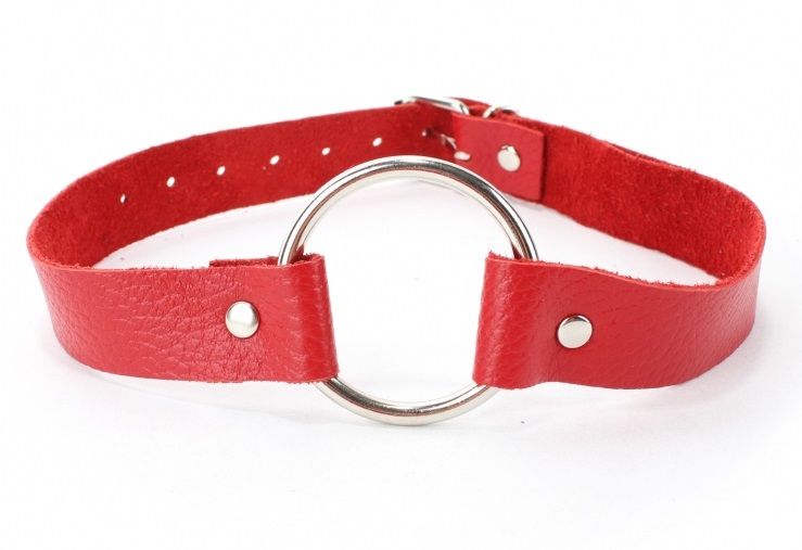 Красный кожаный кляп с кольцом. Застегивается сзади на пряжку.