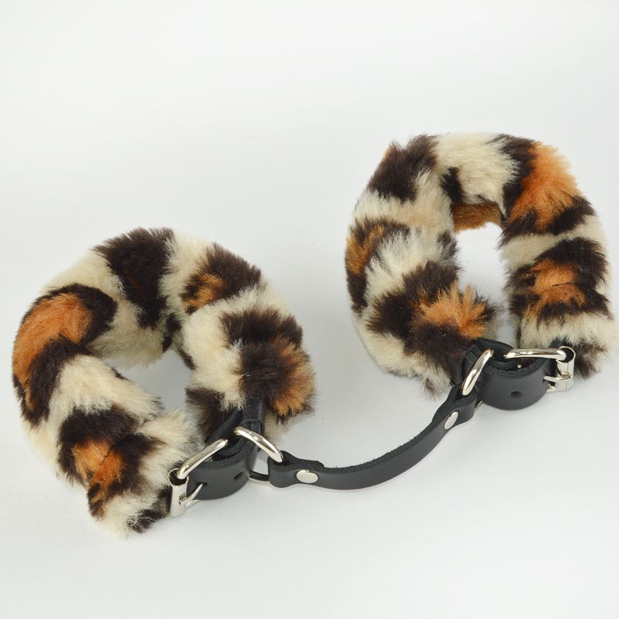 Ремешки наручников изготовлены из натуральной кожи и декорированы съемным искусственным мехом леопардовой расцветки.