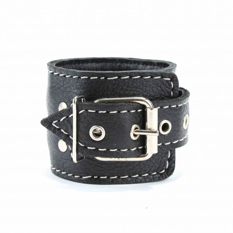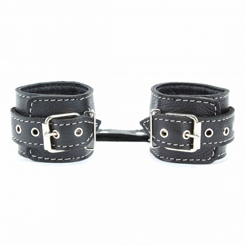 Чёрные кожаные оковы с крупной строчкой.