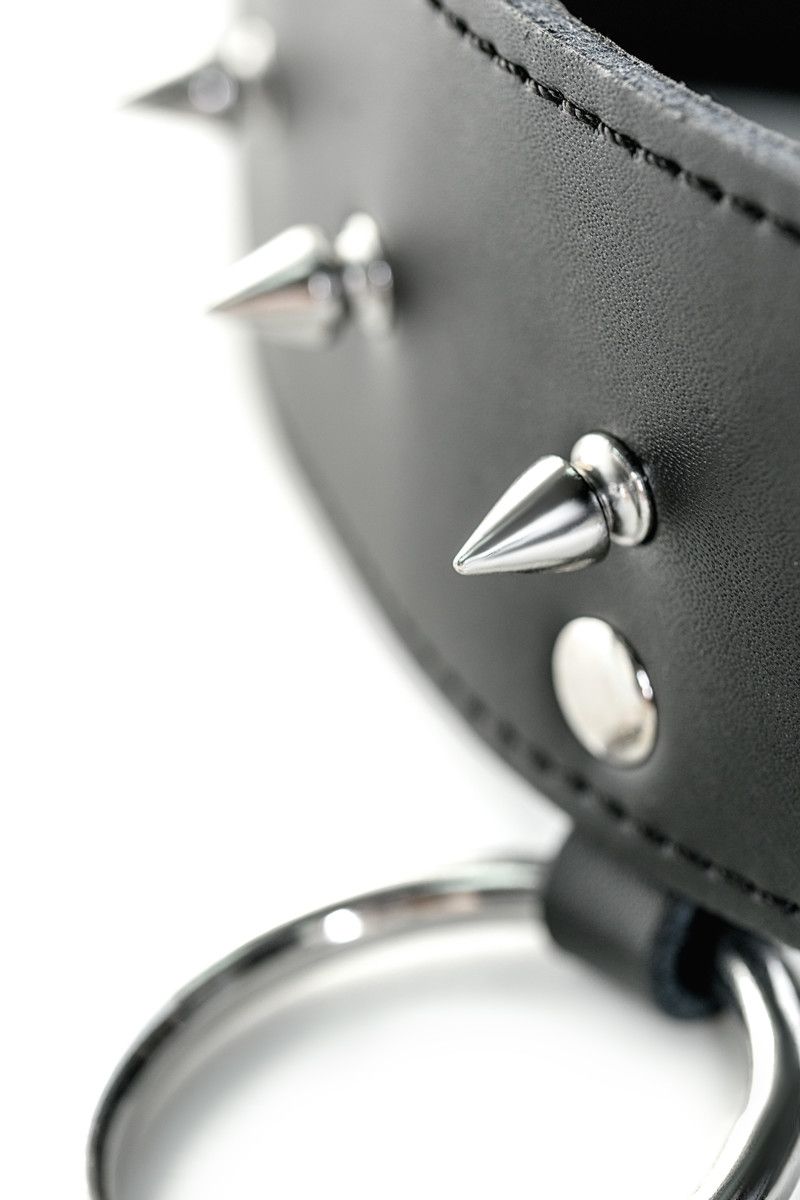Ошейник из мягкой черной кожи. Декоративные шипы и металлические кнопки придают агрессивность. Размер регулируется 3 рядами кнопок.